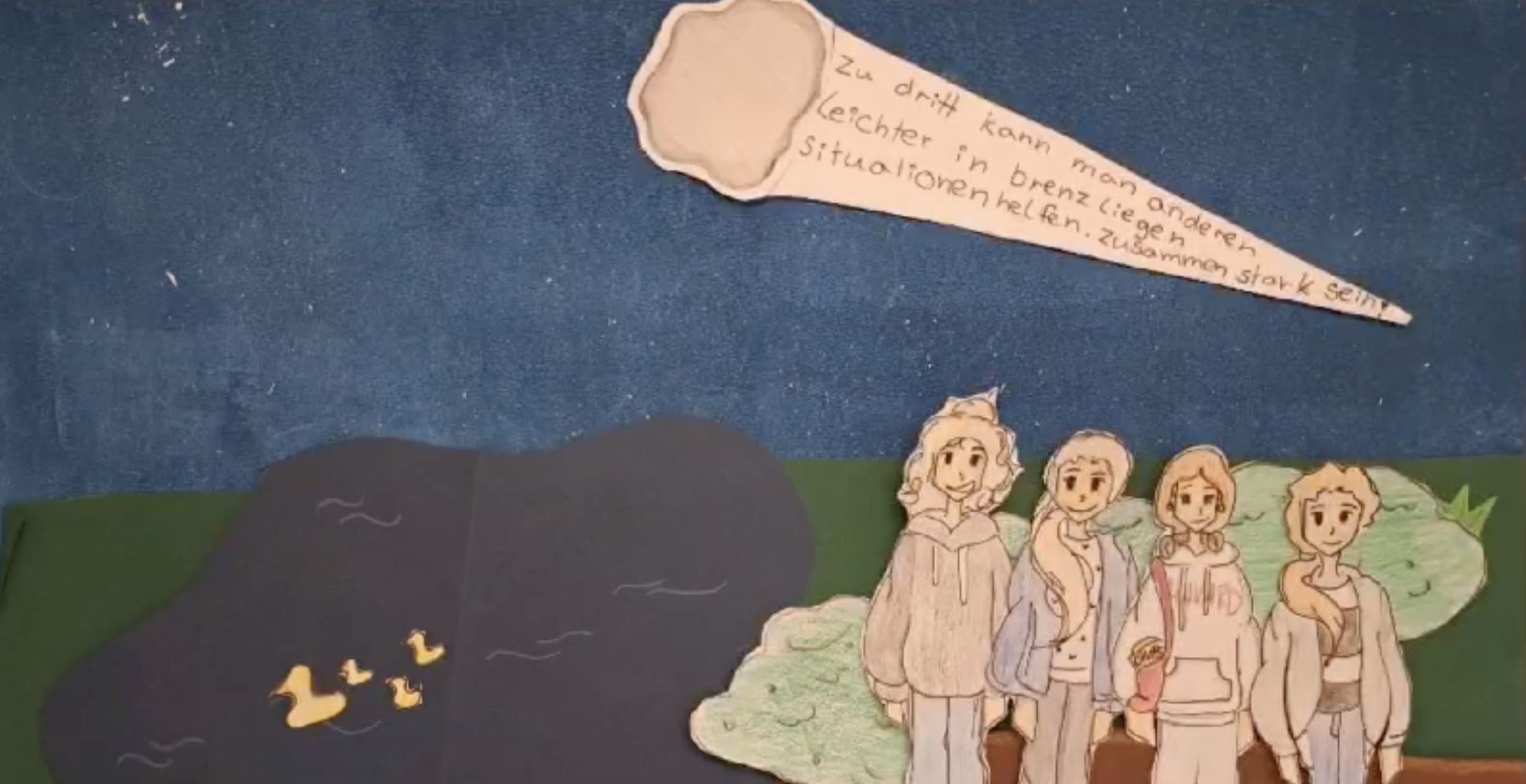 In ihrem Stop-Motion-Film zeigen die Schülerinnen auf kreative Weise, wie eine Person ungerecht oder gewaltsam behandelt wird und wie ihre Freundinnen mutig eingreifen, um gemeinsam Hilfe zu leisten und Solidarität zu zeigen.