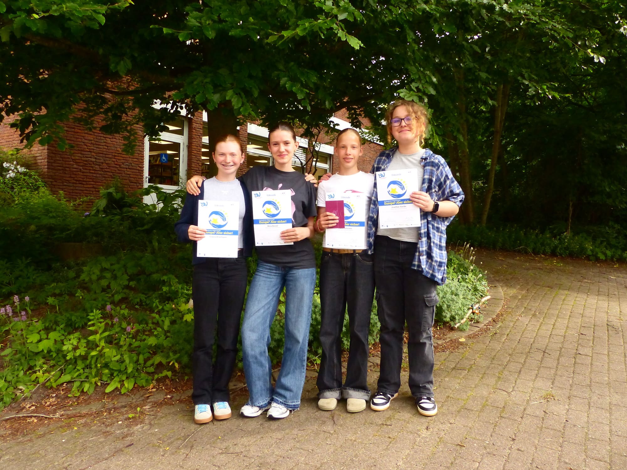 Zum Jahresmotto „Europa? Aber sicher!“ entwickelten die vier Schülerinnen Louisa Bräutigam, Mira Beutel, Josefine Hanke sowie Clara Petersen (aus der jetzigen 9b) einen Stop-Motion-Film über Zivilcourage und gewannen damit einen Landespreis.