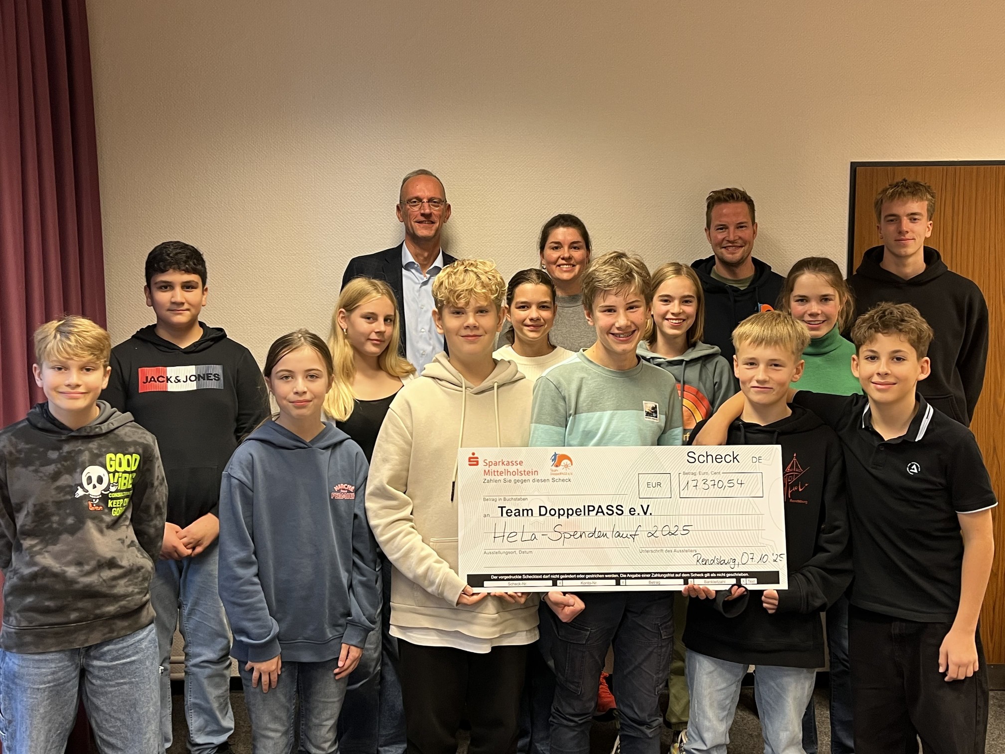 Am letzten Schultag vor den Sommerferien waren Schülerinnen und Schüler der HeLa beim traditionellen HeLa-Lauf wieder für den guten Zweck gelaufen. Dafür hatten sie sich im Vorweg einen oder mehrere Sponsoren gesucht, die je nach gelaufener Strecke eine gewisse Summe für den guten Zweck versprachen. Darüber hinaus gab es einen anonymen Hauptsponsor, der für alle Läuferinnen und Läufer, die den Meisterlauf (4,8 km) in einer Zeit unter 30 Minuten absolvierten, 10€ spendete. Aufgrund dessen kamen allein schon aufgerundet 2000€ zusammen. Weiterhin unterstütze die Schön Klinik den Lauf mit 500€. Die Sponsoren der Schülerinnen und Schüler – oder die Schüler selbst – stockten diesen Betrag auf eine Rekordsumme von 17340,54€ auf, die nun dem Team DoppelPASS e.V. aus Nortorf zur Verfügung steht.